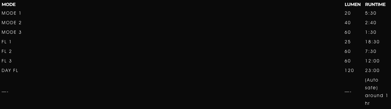 - Max. Lumens: 120LM (FL-1 tested)