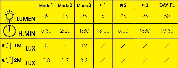 - 3 Steady modes and 4 flashing modes